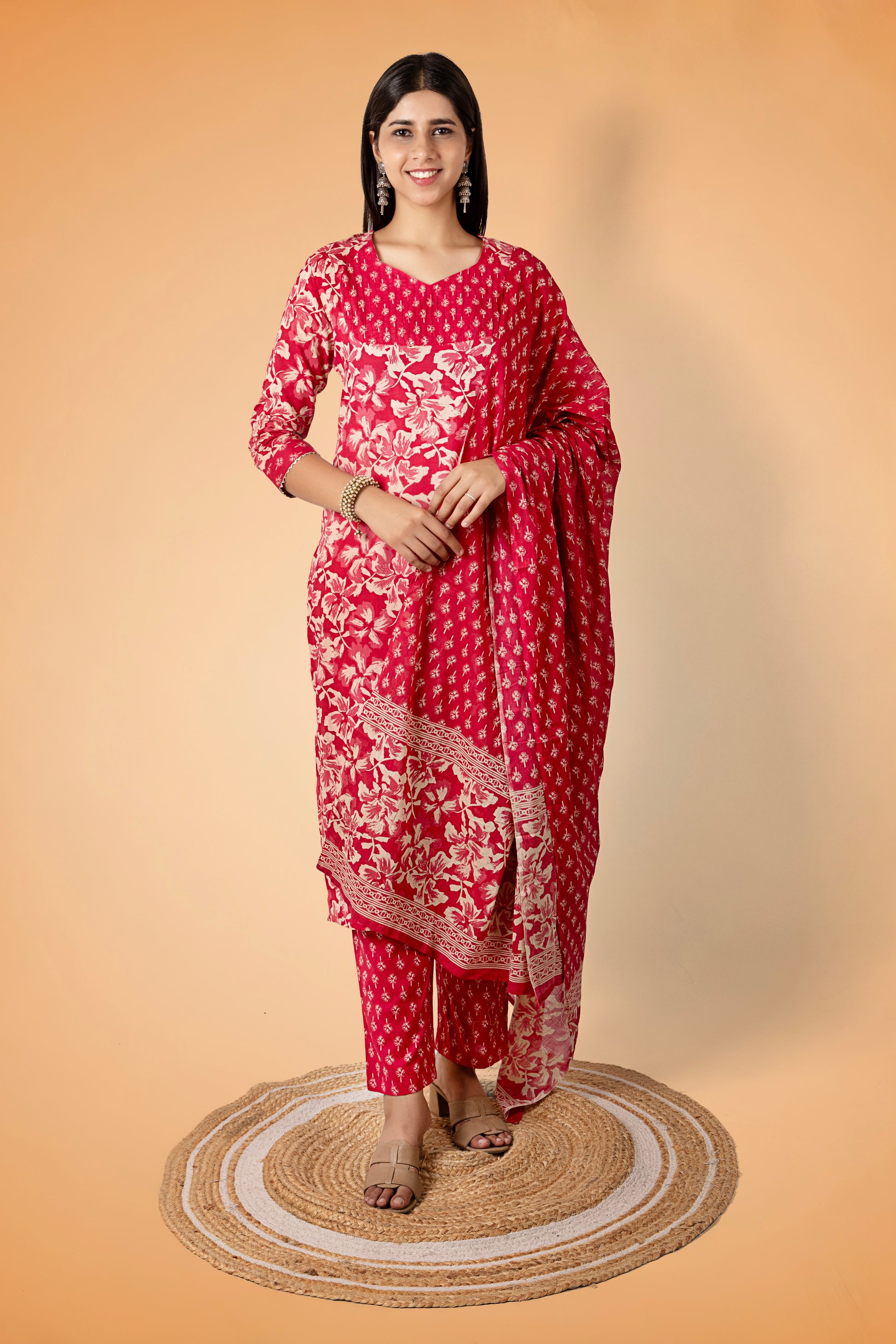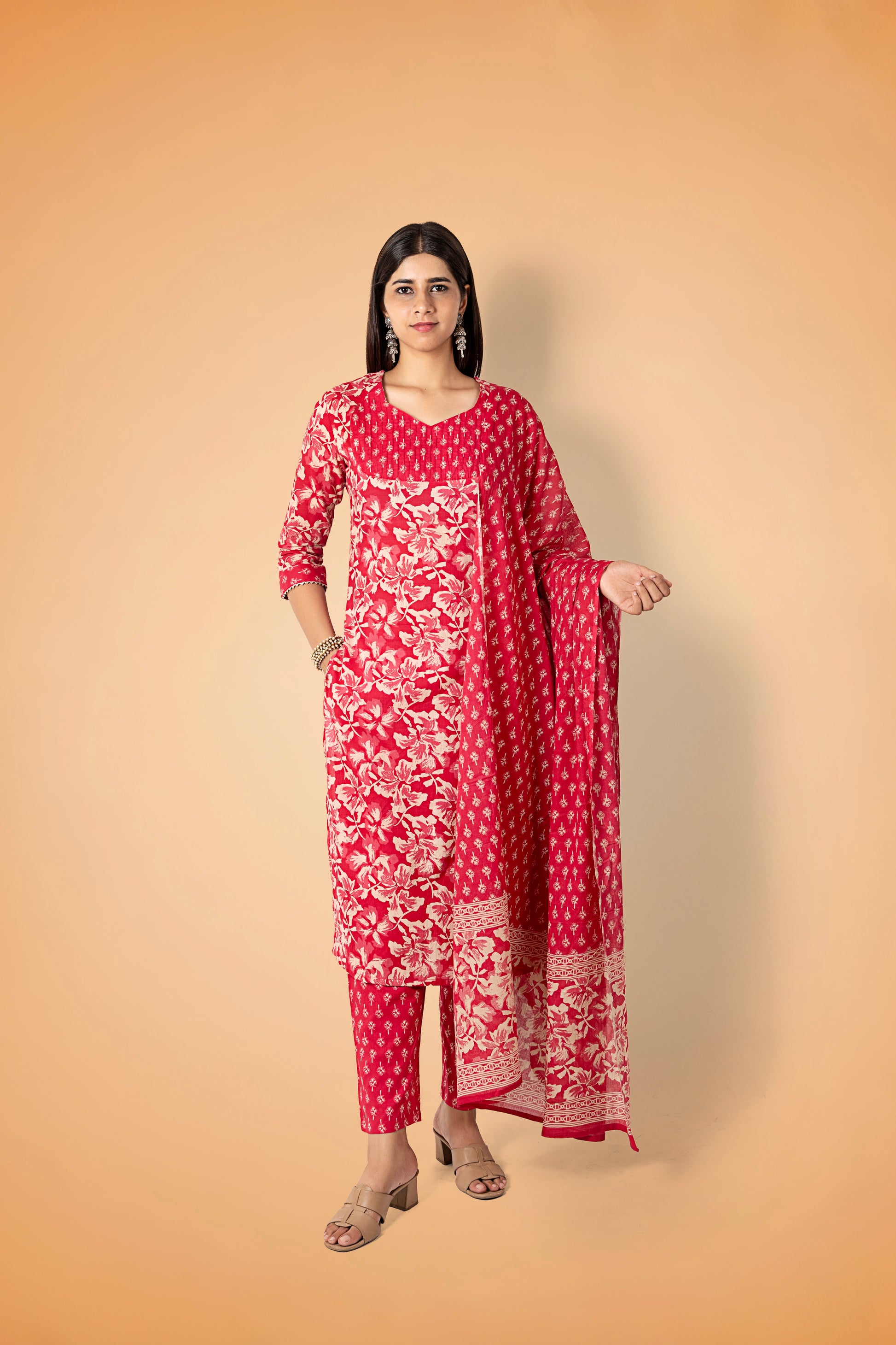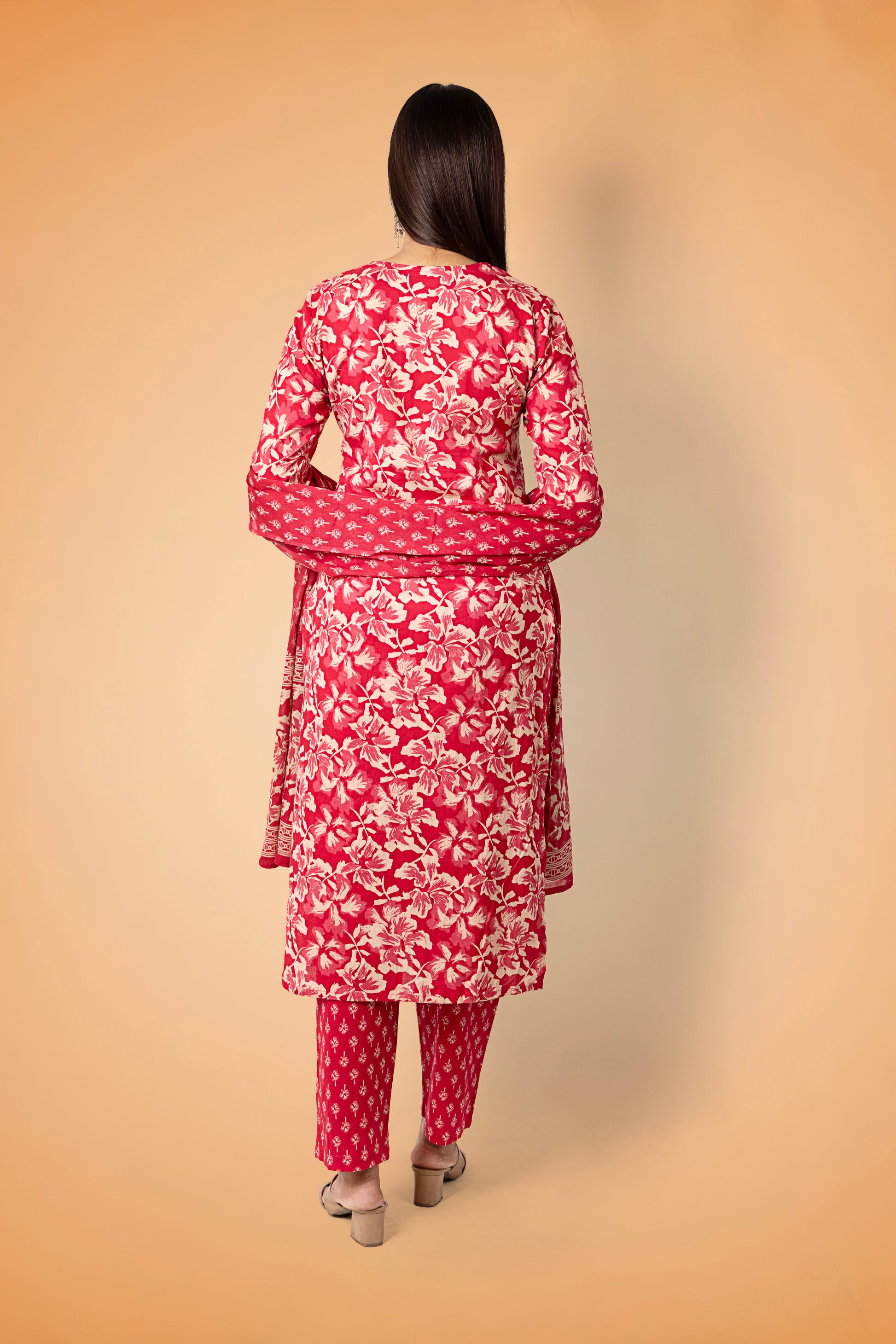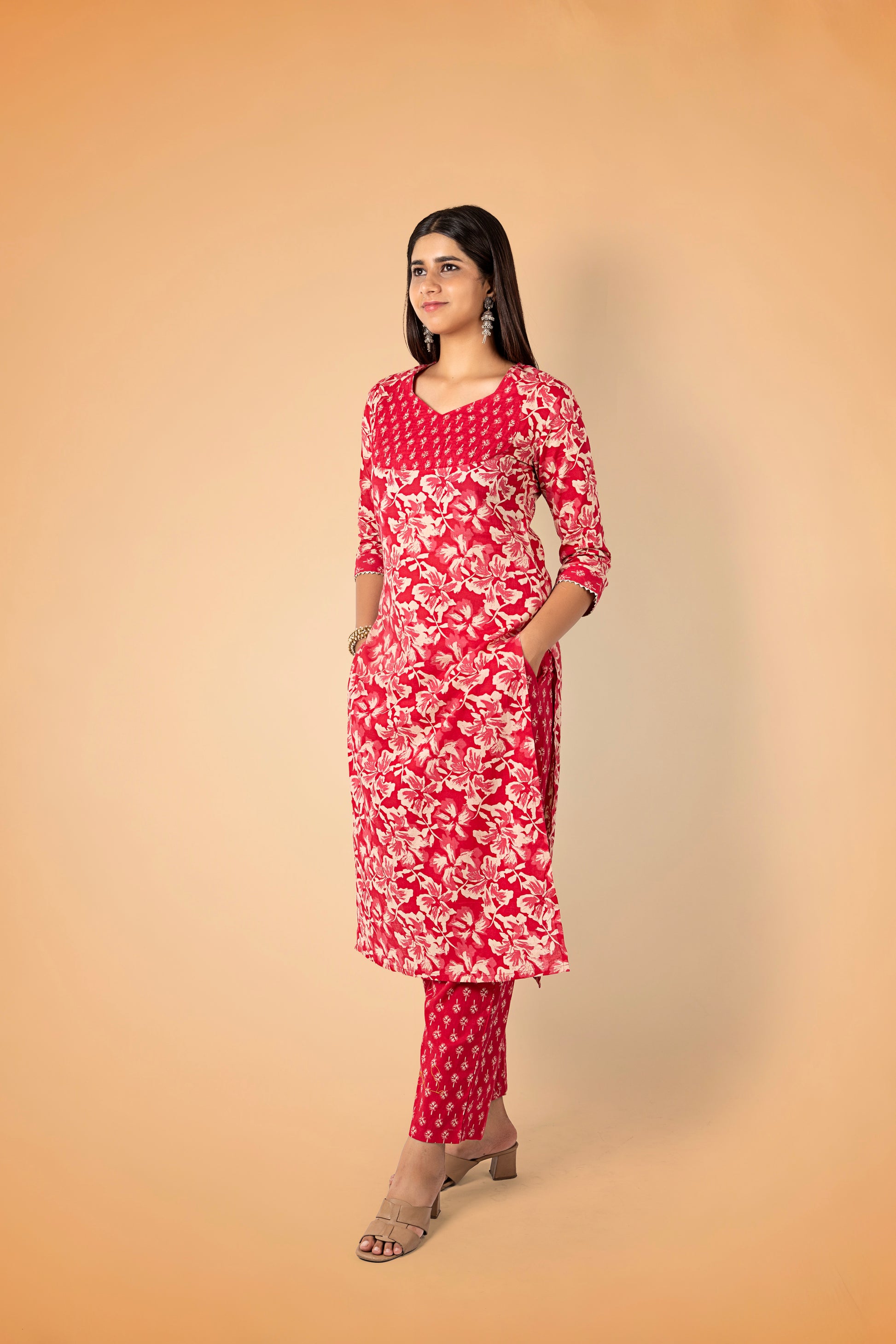 A feminine pink and white kurta set inspired by traditional choli-style patterns. Features a V-neckline, three-quarter sleeves, and two pockets. Completed with printed trousers and a pure cotton dupatta.