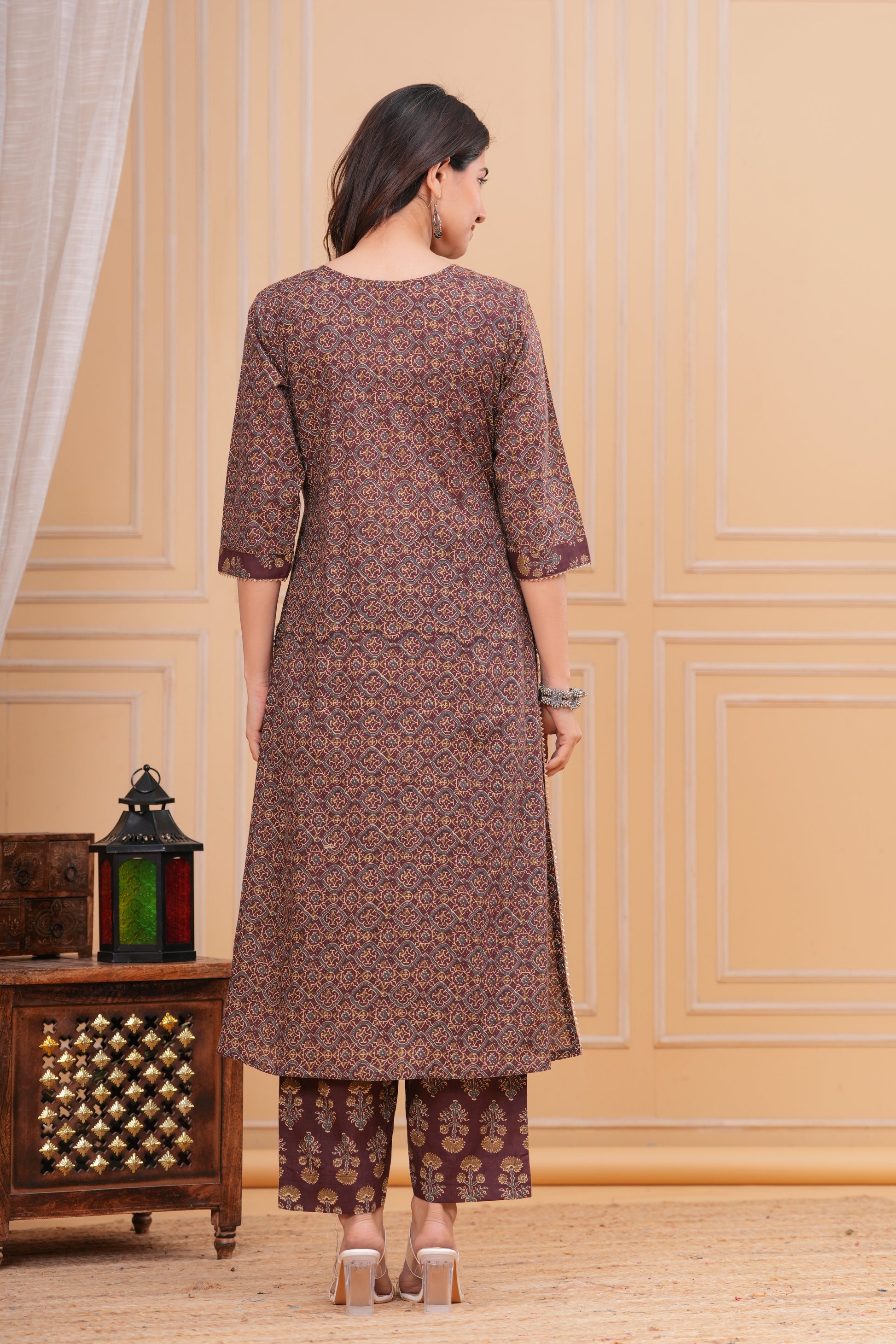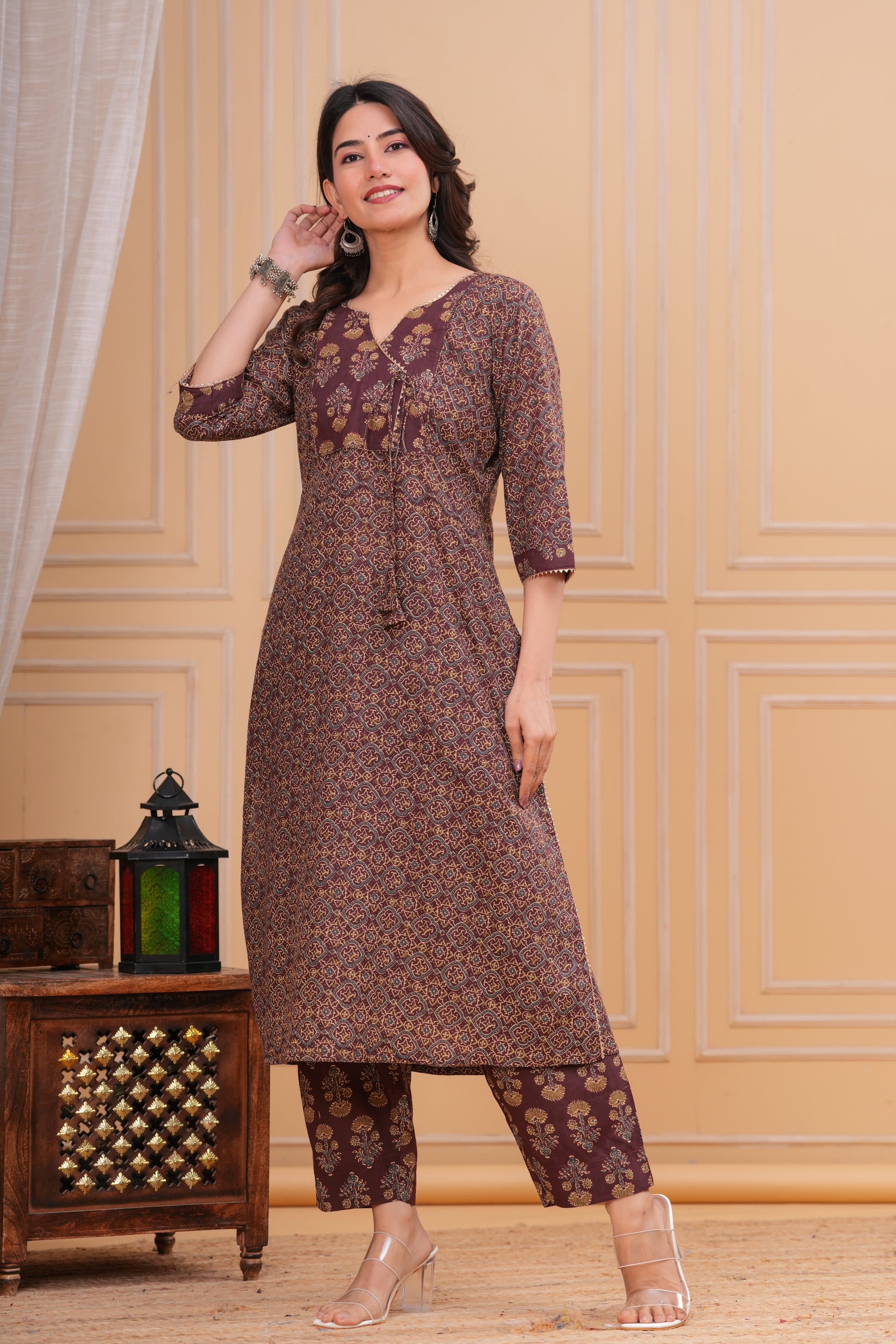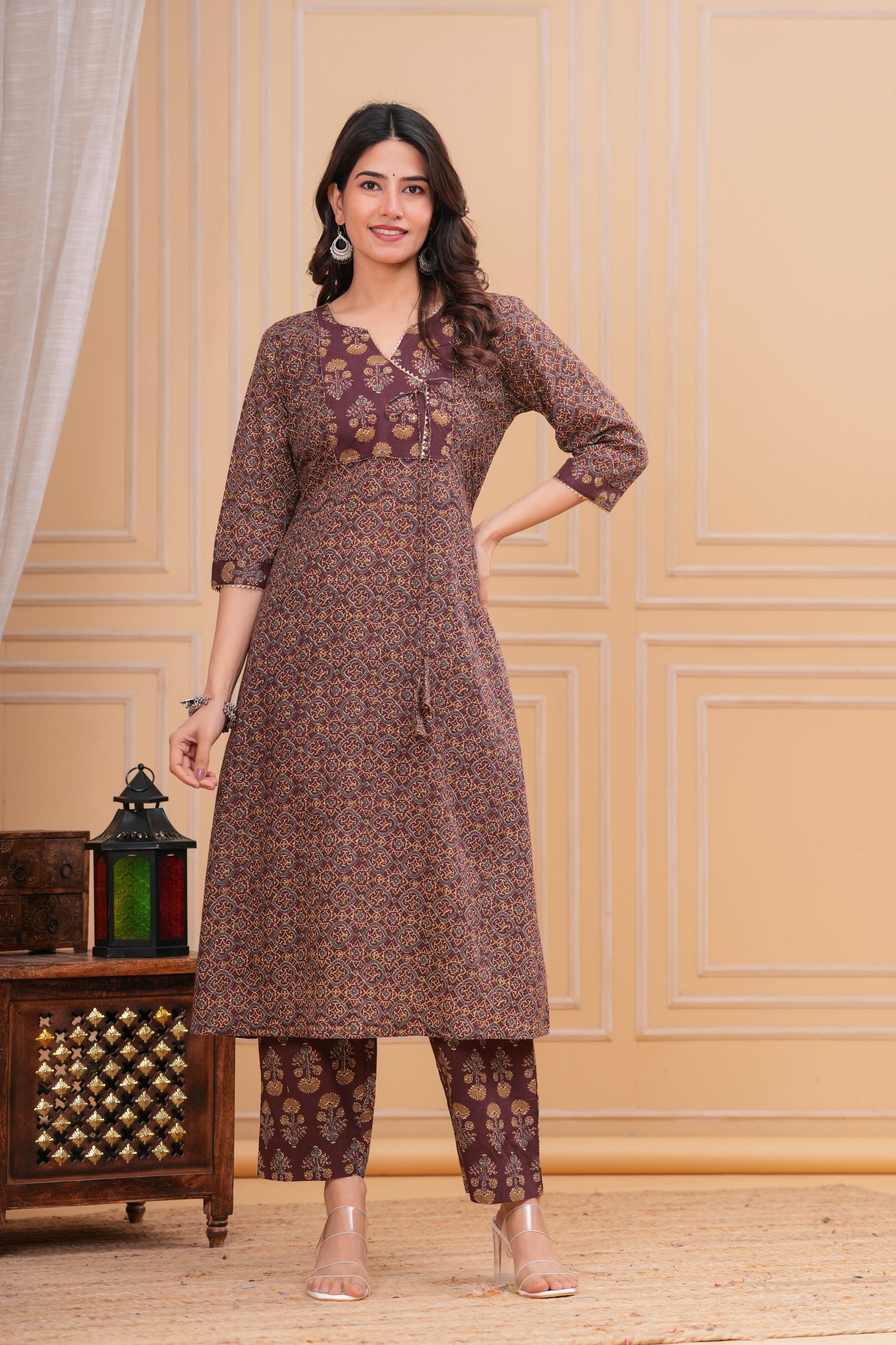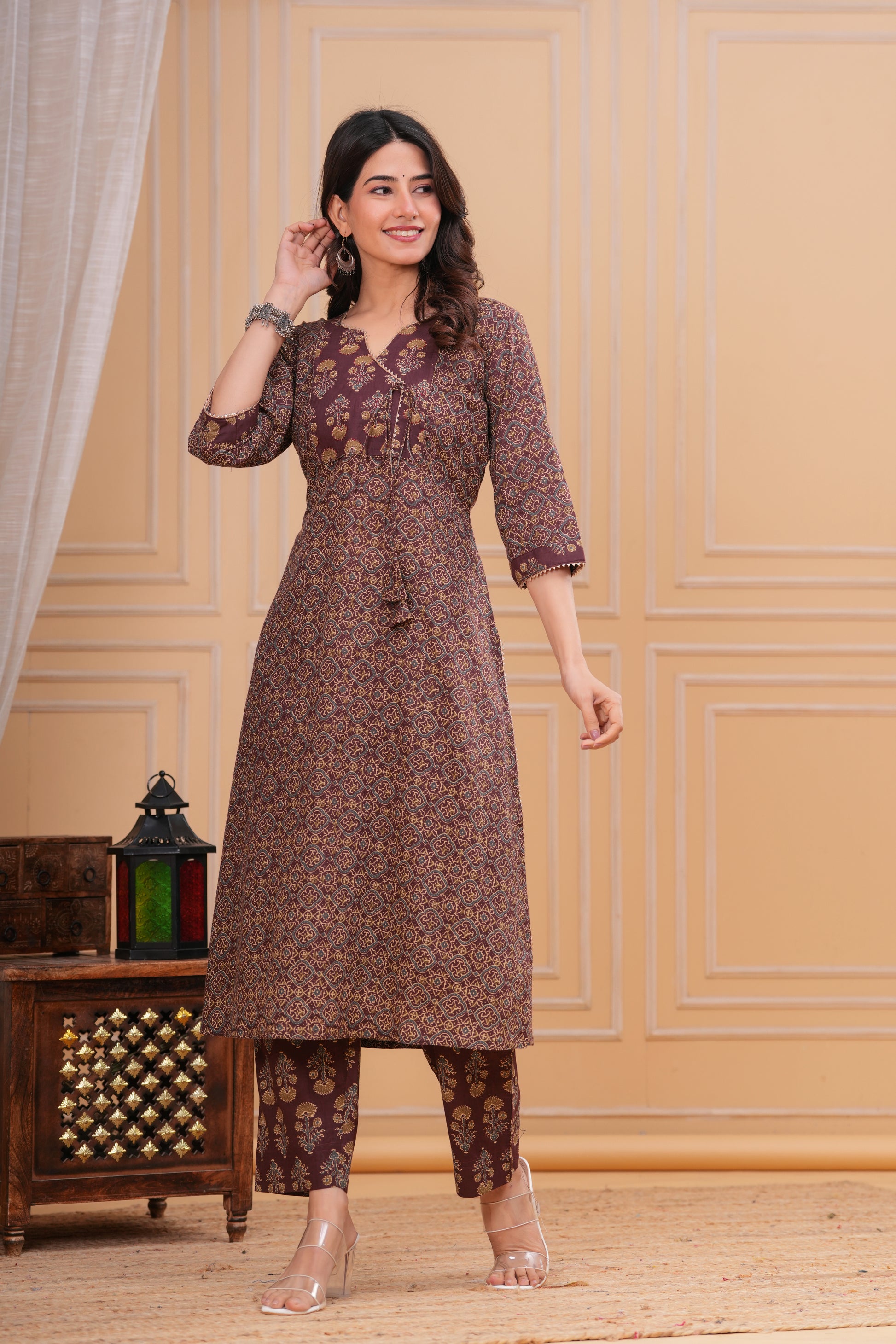 This kurta set features a graceful overlapping front design with intricate traditional motifs on a rich brown base. Designed with a flattering Angrakha-style neck , soft waist gathers, and 3/4th sleeves, it offers both elegance and comfort. Paired with coordinated straight-fit printed pants, it creates a refined and timeless traditional look.