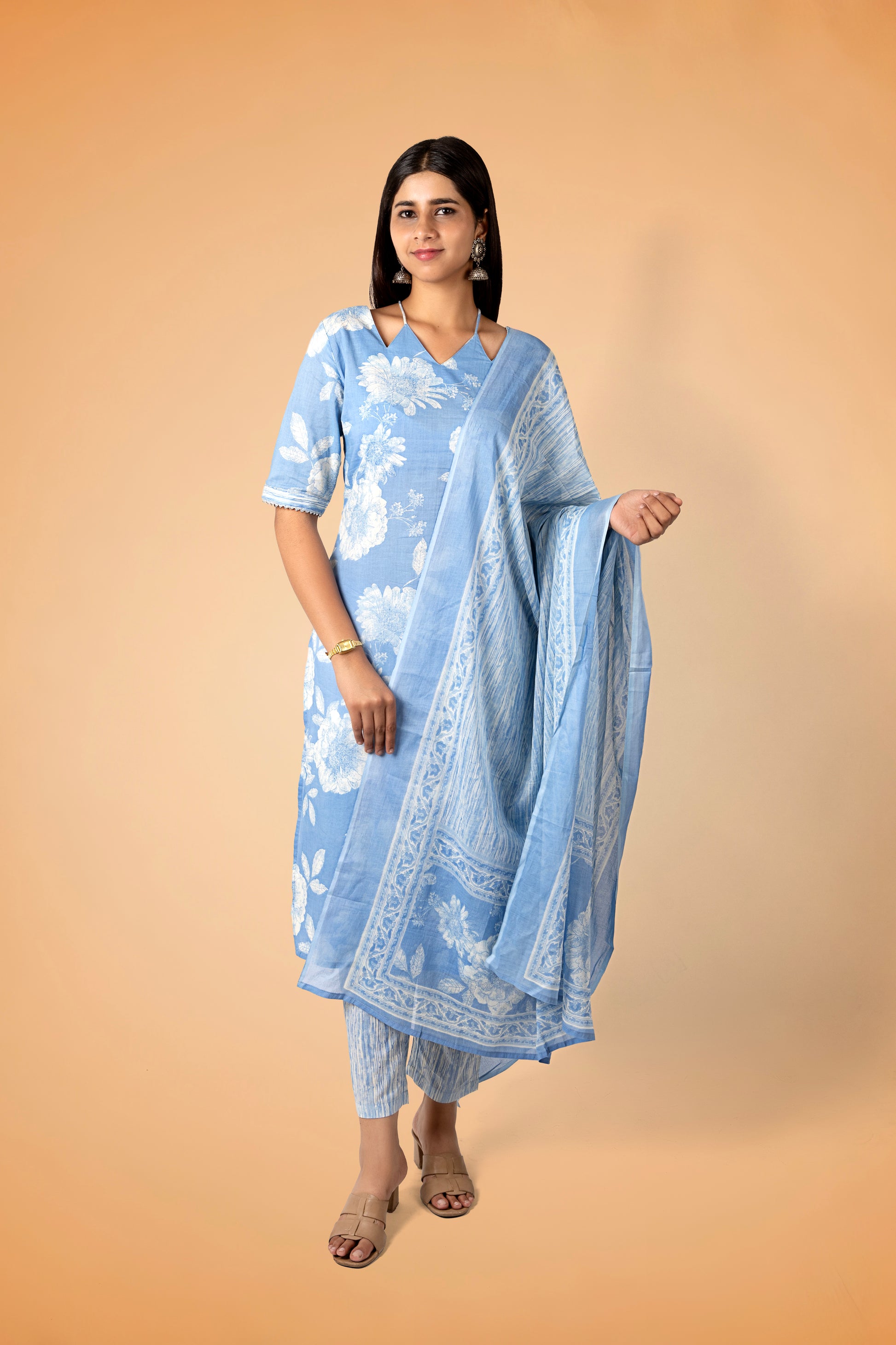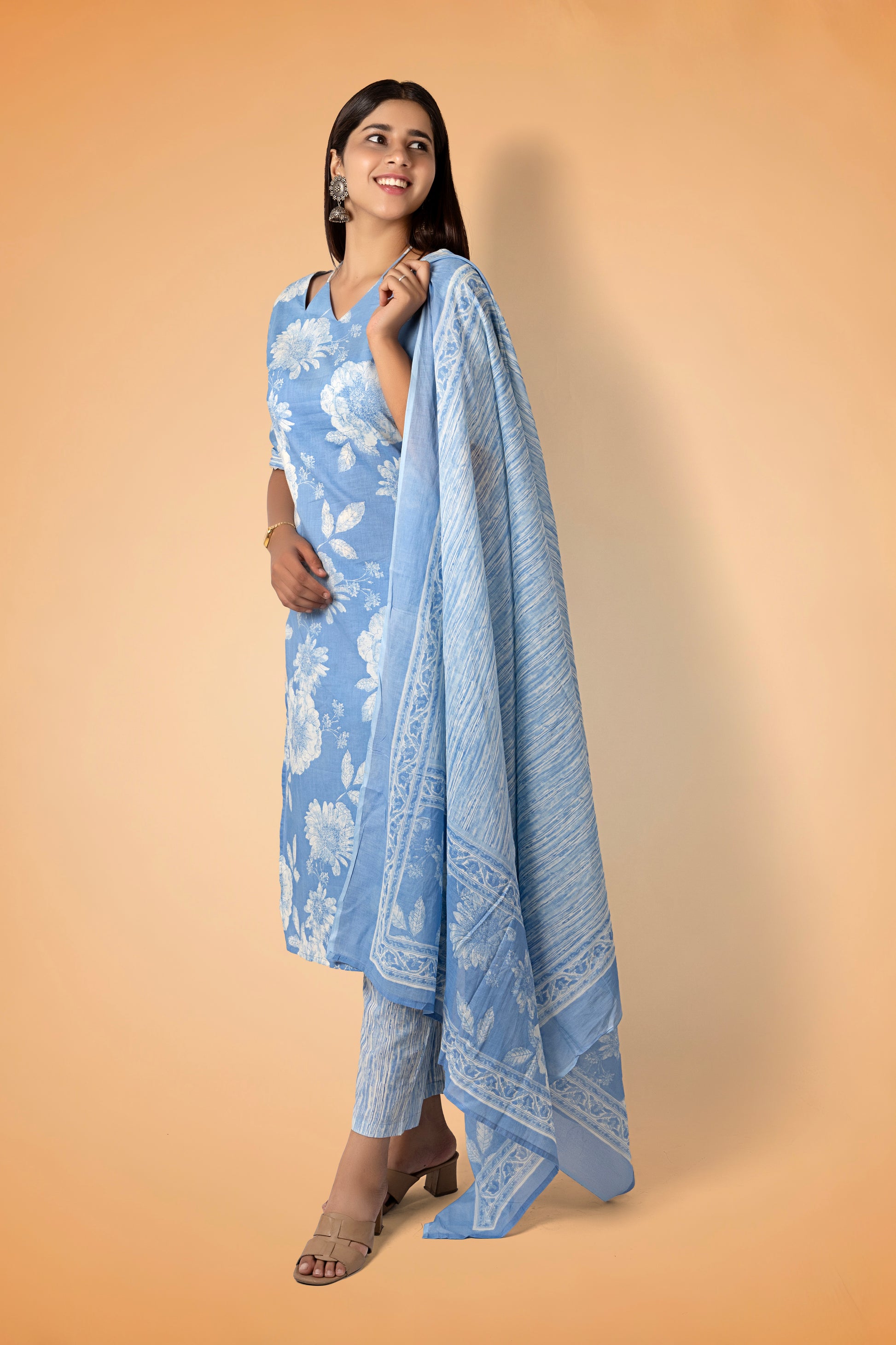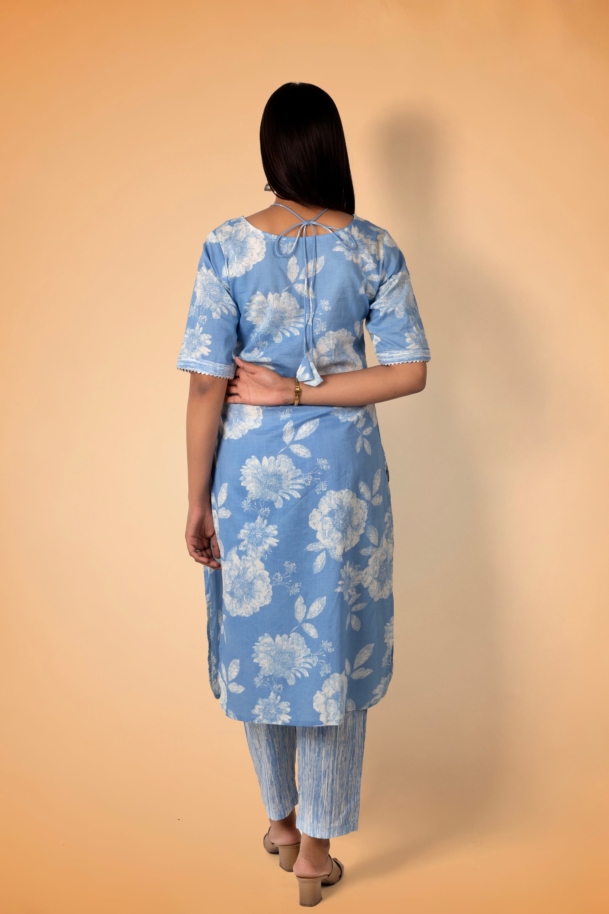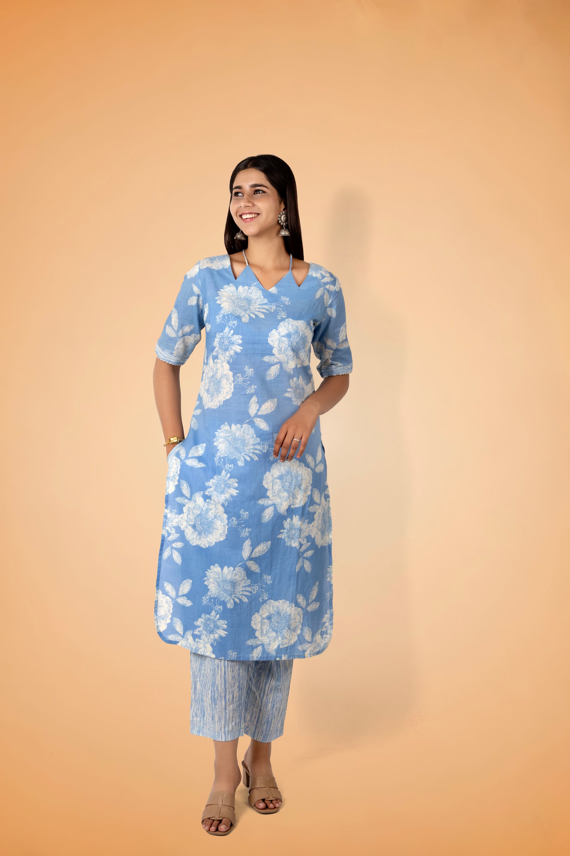 A calming sky-blue printed kurta set in breathable pure cotton. This kurta includes a stylish V-neck, elbow sleeves, a straight silhouette, and two pockets. Comes with matching printed trousers made from pure cotton.