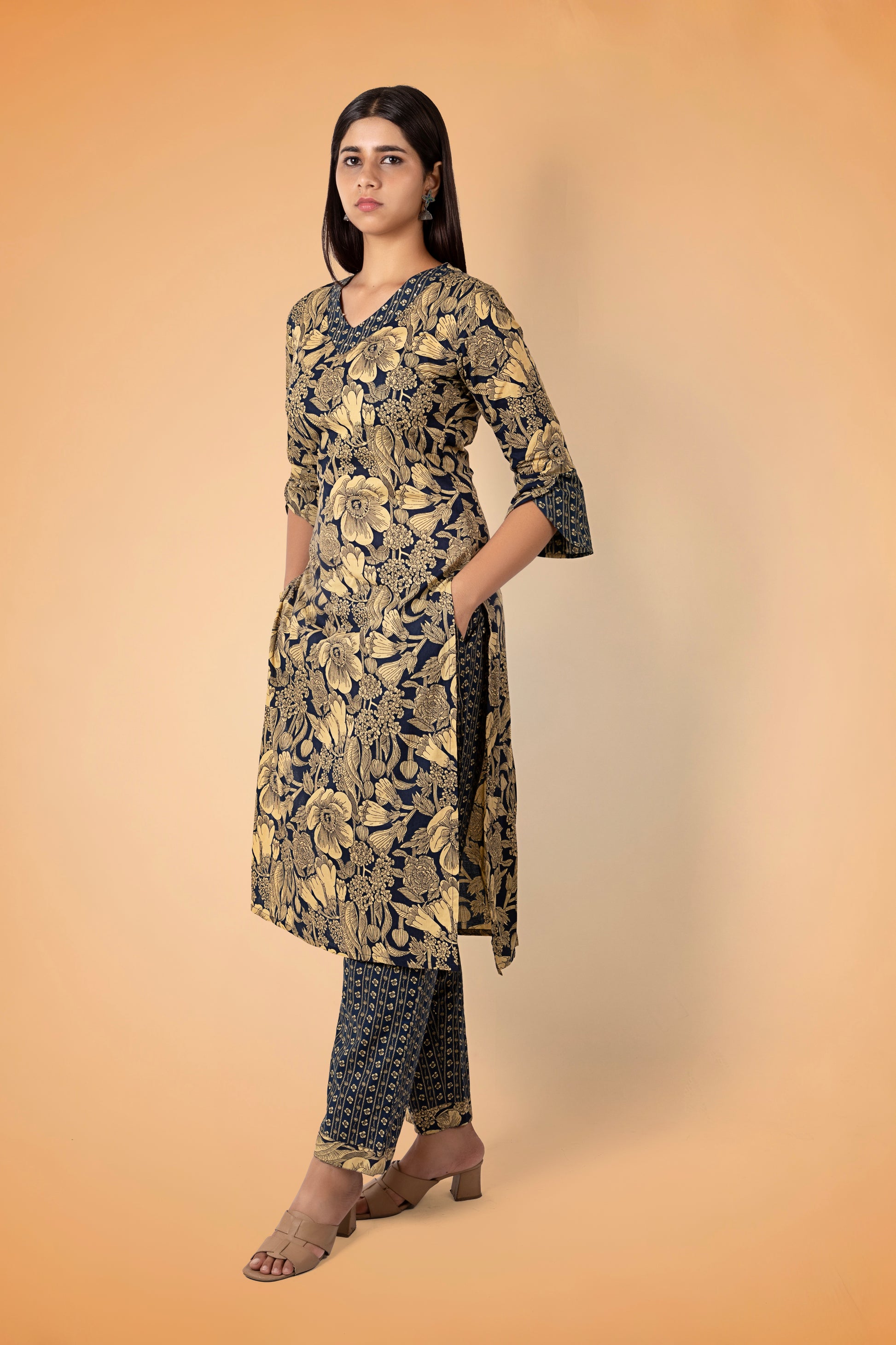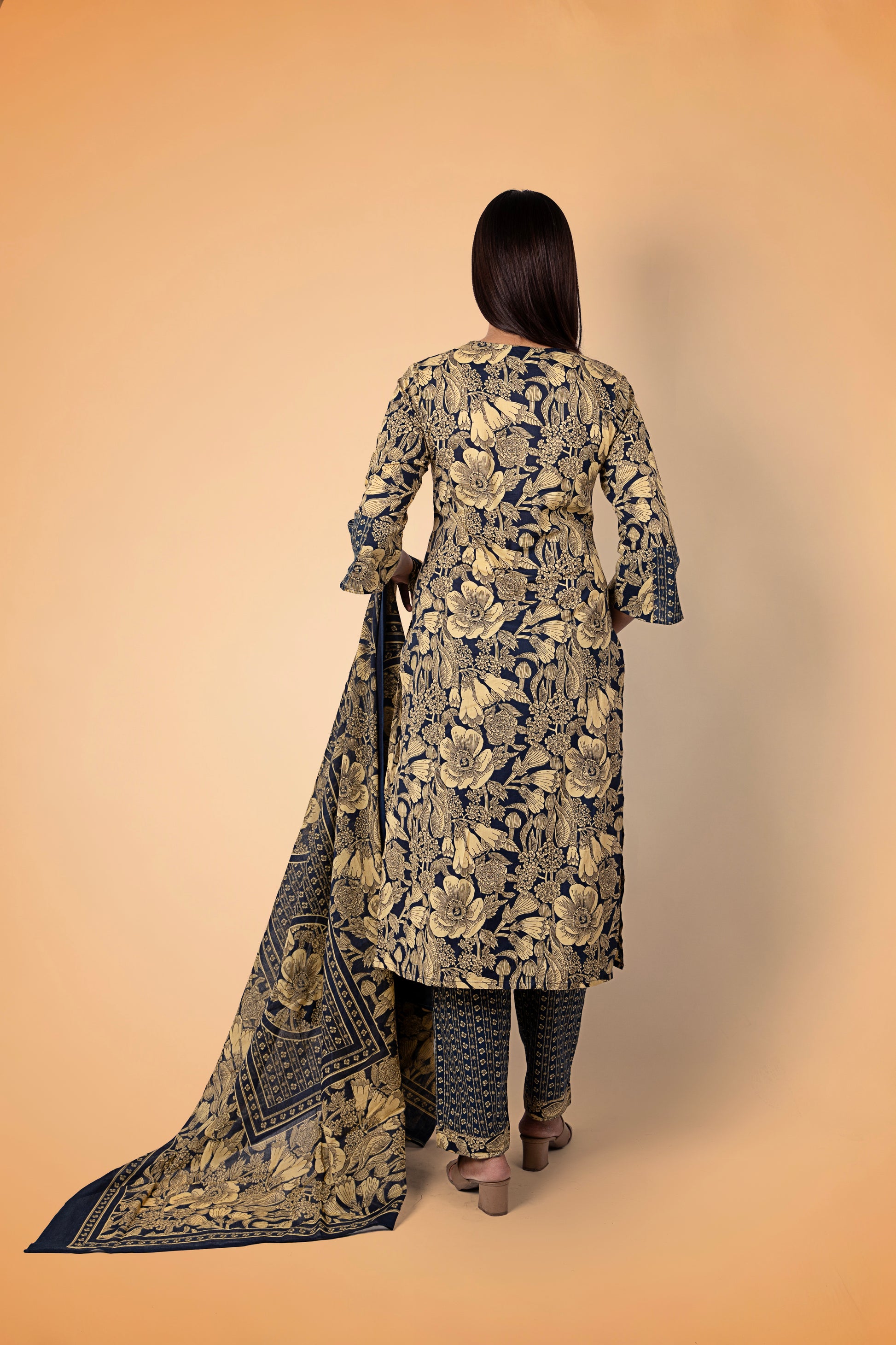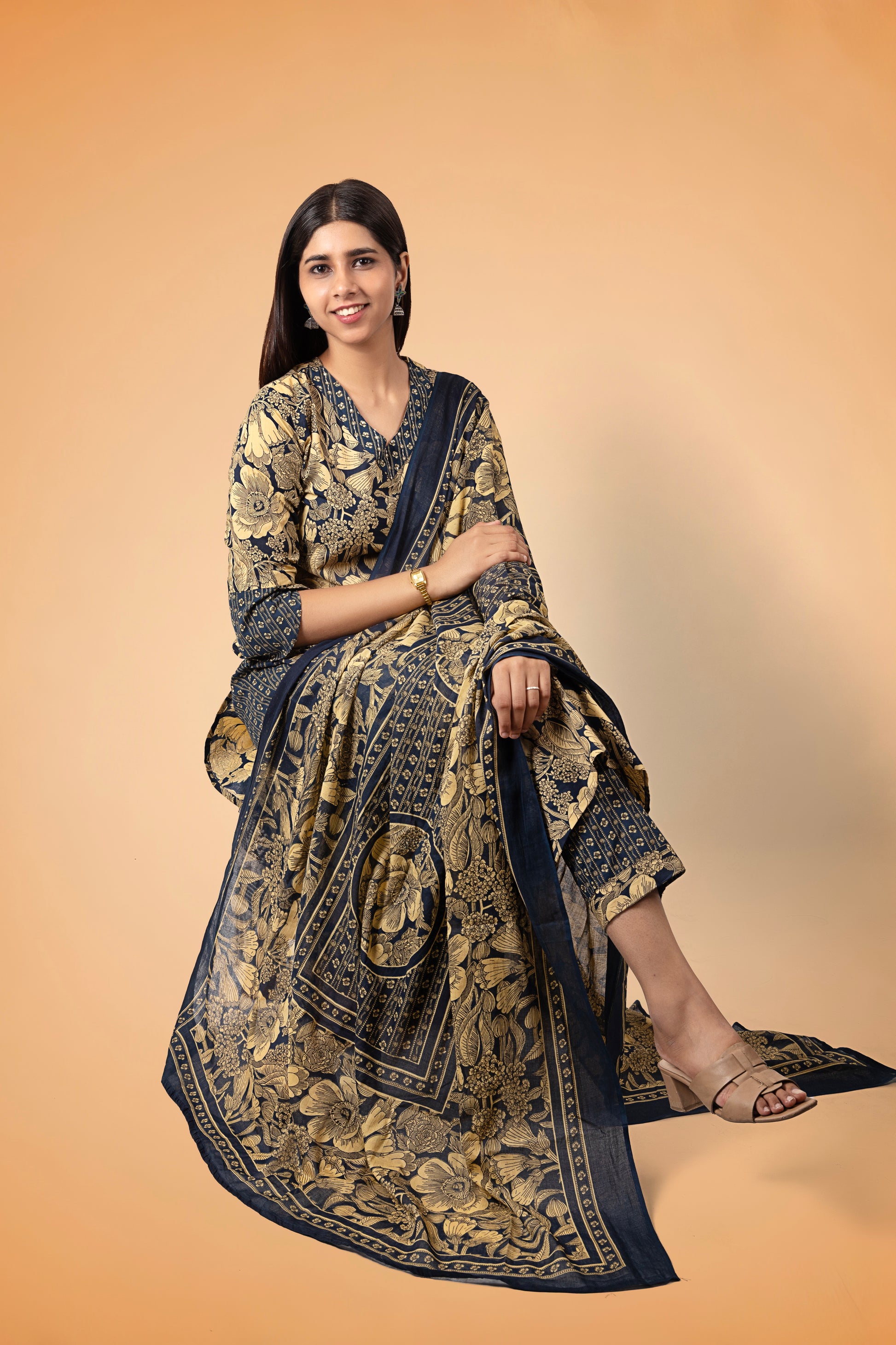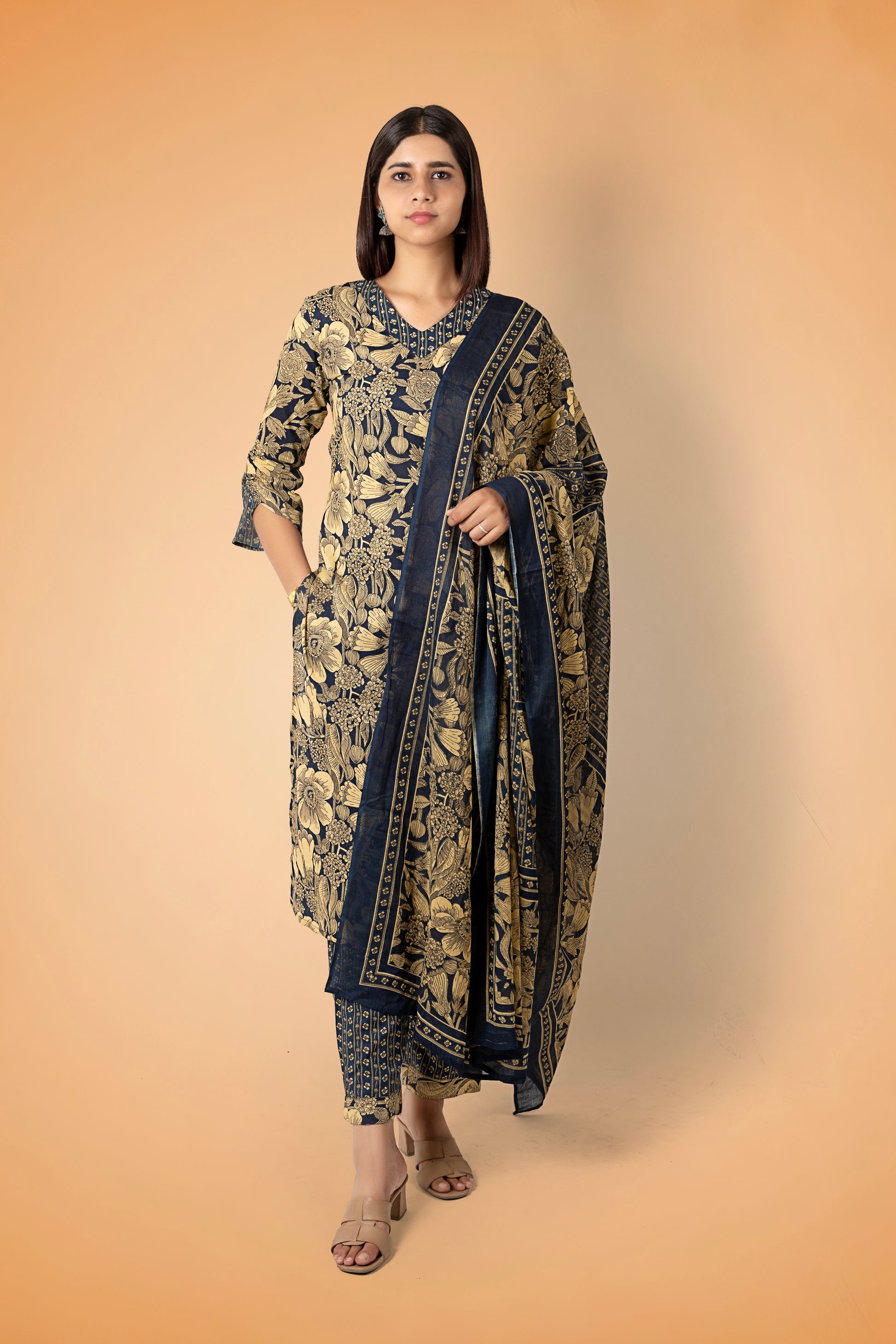 A premium navy blue kurta set enriched with muted gold floral prints. The kurta is crafted from pure cotton, features a V-neck, bell sleeves, and two pockets. Comes with printed trousers and a matching cotton dupatta.